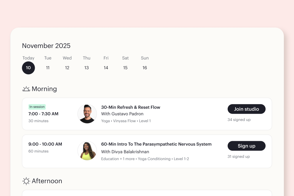 Another important aspect of My Studio is the schedule. We wanted to replicate the predictable, yet flexible, schedule of a physical studio: Each week, you’ll find classes with themes by your favorite teachers, so whether you’re looking for a powerful morning vinyasa, a class for seniors a teacher’s practice, a flow with your favorite teacher, a prenatal class or an evening wind-down – My Studio will have something you can return to each week. When we simplify the daily decision of what to do or when to do it, we free up mental energy for how we want to show up. My Studio’s weekly rhythm provides the gentle guidance of classes curated into clear time slots, while still allowing you to practice when it fits your day.